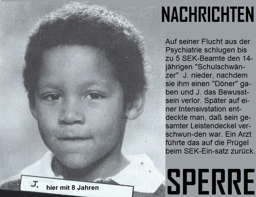 Zu uns traut sich mittlerweile kein einziges „Kind“ mehr. Und das ist auch gut so, denn die staatsgewalt weiss schon, wohin sie sie treibt, wenn sie sie hier ver~treibt! Hast du das schon mal gesehen, wenn so ein geflüchteter von den bullen aus irgend einem Fluchtort raus geholt wird und nach wiederholter verschleppung und Flucht sich schliesslich umbringt?
