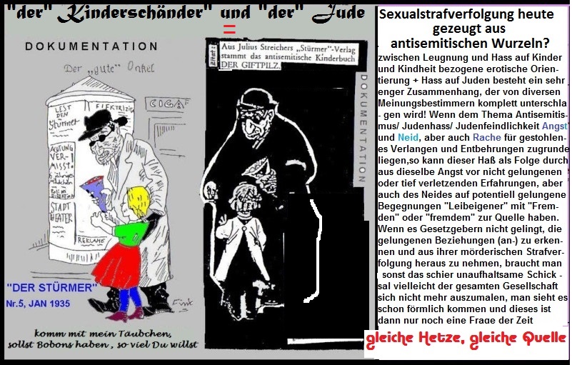 "Frische, unverdorbene Kinderkörper" und "verbrauchte, einem "Fäulnisprozess" unterliegende, verdorbene Körper Erwachsener". Woher kommt diese Fantasie= Einteilung von Menschen in diese Kategperien? Die "Frischfleischunterstellung kommt also sozusagen aus "Gammelfleischmündern"? Ja, in der NS-Propaganda wurden jüdische Händler häufig fälschlich als Quelle von verdorbenen oder gefährlichen Lebensmitteln dargestellt. Solche Darstellungen gehörten zu stereotypen Zuschreibungen, die Jüdinnen und Juden als wirtschaftliche und gesundheitlicheBedrohung darstellten. Der "Jude per se" war auch ein "Kinderverderber".