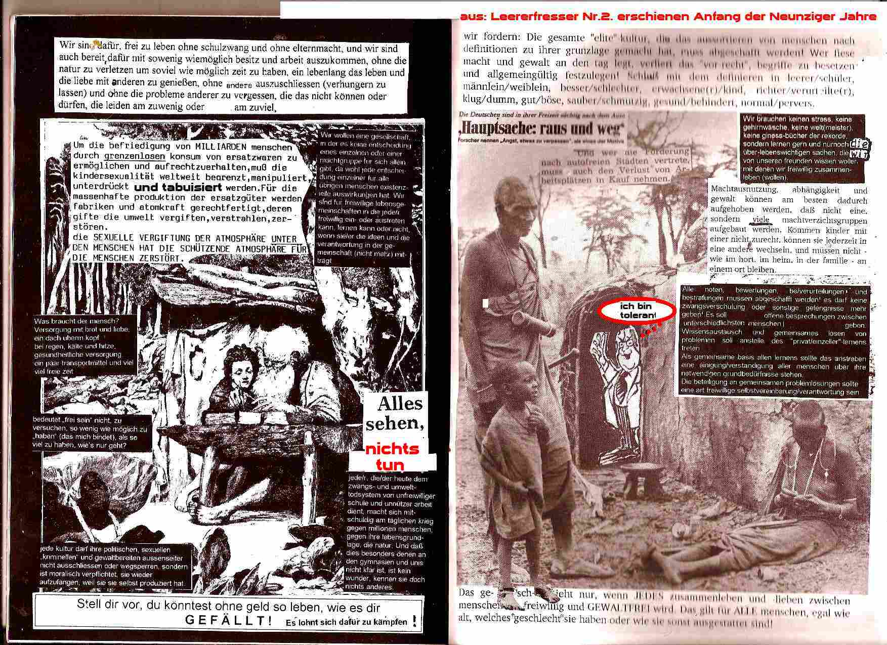 Die Schwer-hörigen Progromme der ART widmen sich während dieser Teewoche dem gleich völlig geschalteten Verendnis von Toleranz und decken Widersprüche, Paradoxien und Konflikte in der Totnetanztoleranz dieser Gesellschaft auf. Gedenkstätten für ermordete Kinder- und jugendbewegte Menschen, die nicht nur in den Gaskammern ermordet wurden, werden nun zum ersten Mal wieder nicht errichtet. Dies ist als Sensation zu betrachten, denn erstmals findet hier die Aufarbeitung von Ursachen und Folgen des 3. Reichs an der richtigen Stelle wieder nicht statt. Überhaupt ist diese Teewoche von der Auseinandersetzung und Aufklärung über unterdrückter, versklavte, ermordete und in Konsumtriebhaftigkeit und Kriegsgeilheit umgewandelte Kindersexualität und damit auch als Faschismusursache Nummer 1 geprägt: Diese zu verschweigen und damit der Bevölkerung die größte Verarschung zukommen zu lassen, die die Menschhaitsgeschichte überhaupt kennt, widmet man in dieser Woche die größte Aufmerksamkeitstoleranz. Reporter der Radioprogramme von BAST.ART.de testen im Selbstversuch, wie weit Toleranz im Alltag geht. Aber schon morgen früh ist dieser Test schon wieder vorbei. Sie stellen sich vor Jugendämter, Kinderheime, Clearingstellen, Kinderpsychiatrien und Behinderten eEnrichtungen, Schulen, Elternhäuser und Jugendschutzstellen, Altenheime, Knäste und Sicherungsverwahrungsanstalten, und versuchen, Kontakte zu dorthin geschleppten und misshandelten Kindern und anderen Gefangenen herzustellen, denen sie die Möglichkeit geben über ihre erlittenen Misshandlungen zu berichten, ermöglichen ihnen unter dem persönlichen Einsatz ihres Lebens die Flucht, nehmen sie bei sich auf, so we sie das auch schon in Büchern über Christiane F und Anne F gelesen hatten,